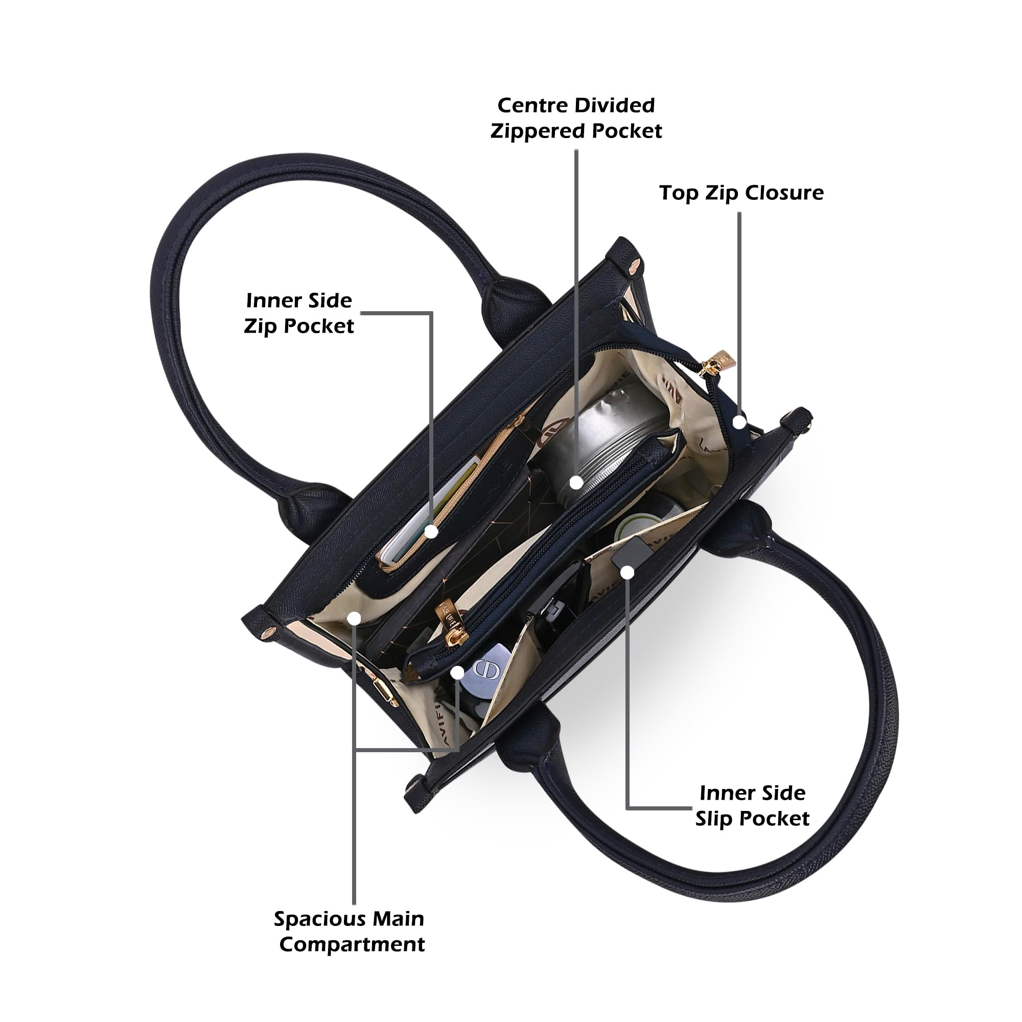 - Your essentials will stay organised with the zipper closure on the two compartment satchel. There is plenty of space in the bag’s spacious sections with multipurpose pockets to store items like a phone, portable charger, keys, wallet, hairbrush, sunglasses, and sanitizer.